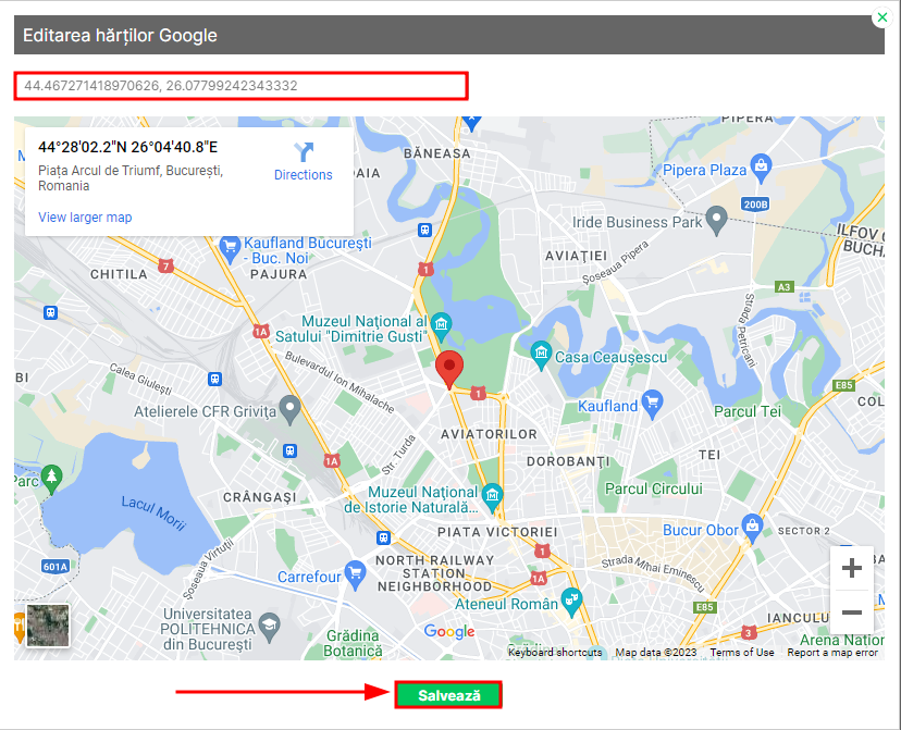 Dacă doriţi să marcaţi o anumită adresă pe hartă, căutaţi-o în câmpul corespunzător din editorul Google Maps şi setaţi un nivel de zoom în colţul din dreapta jos.