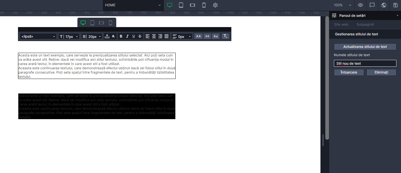 Pentru a adăuga un nou stil de text, accesați Panoul de setări, intrați pe Site Web și în „Stiluri de text” selectați „Adăugați un nou stil de text”.